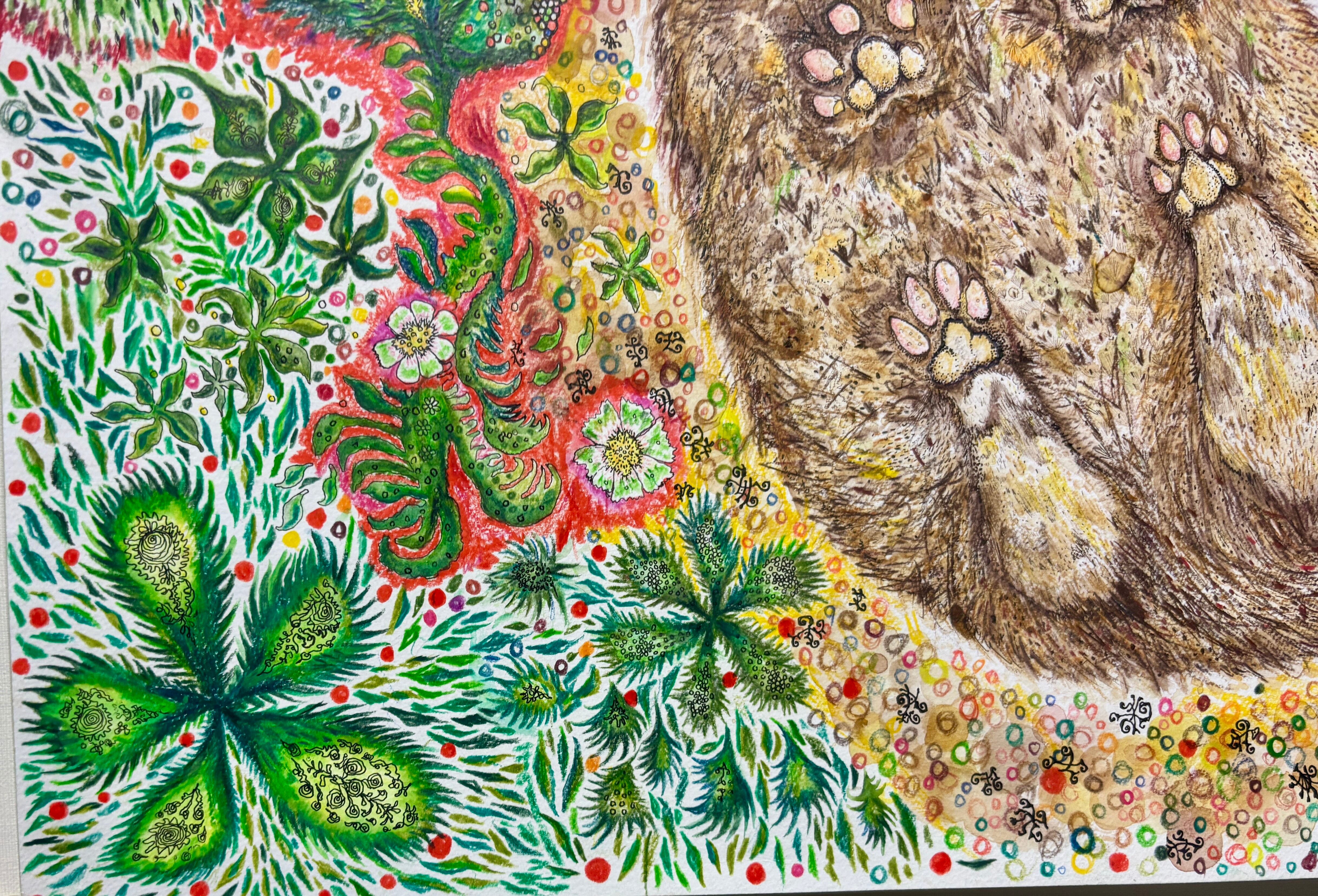 紙にペン、色鉛筆、鉛筆、コーヒー